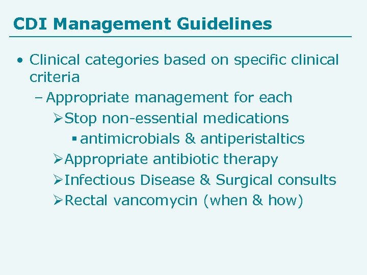 CDI Management Guidelines • Clinical categories based on specific clinical criteria – Appropriate management for each ØStop non-essential medications § antimicrobials & antiperistaltics ØAppropriate antibiotic therapy ØInfectious Disease & Surgical consults ØRectal vancomycin (when & how)
