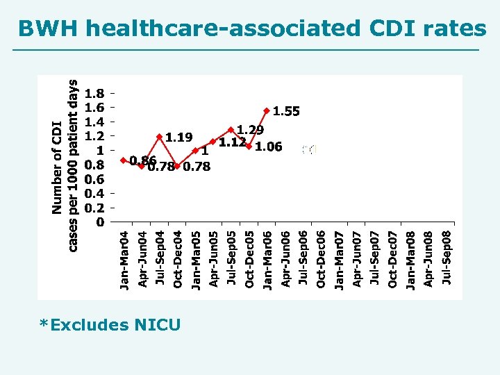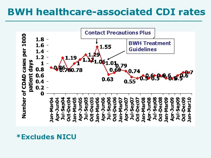BWH healthcare-associated CDI rates Contact Precautions Plus BWH Treatment Guidelines *Excludes NICU