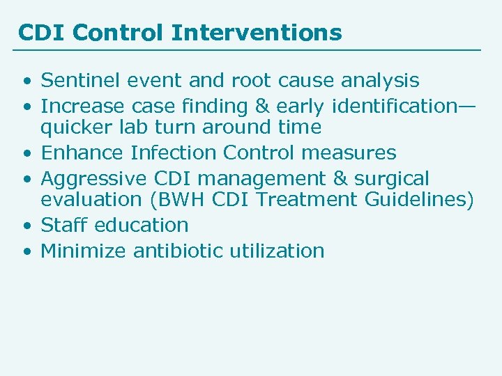 CDI Control Interventions • Sentinel event and root cause analysis • Increase case finding & early identification— quicker lab turn around time • Enhance Infection Control measures • Aggressive CDI management & surgical evaluation (BWH CDI Treatment Guidelines) • Staff education • Minimize antibiotic utilization