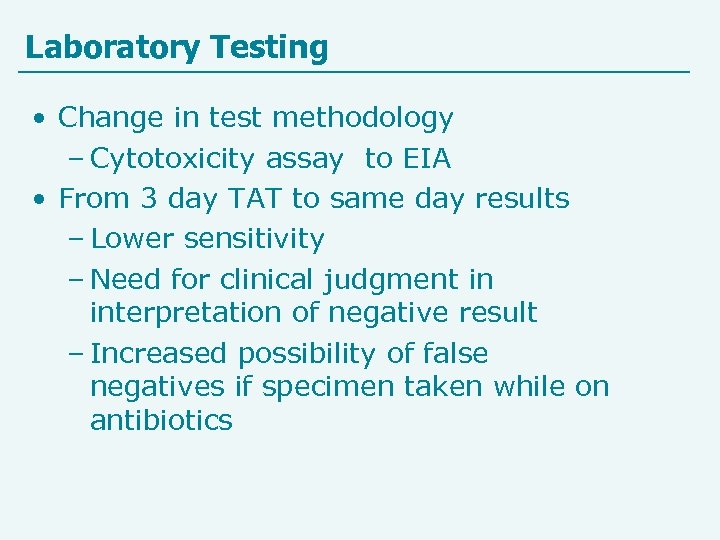 Laboratory Testing • Change in test methodology – Cytotoxicity assay to EIA • From 3 day TAT to same day results – Lower sensitivity – Need for clinical judgment in interpretation of negative result – Increased possibility of false negatives if specimen taken while on antibiotics