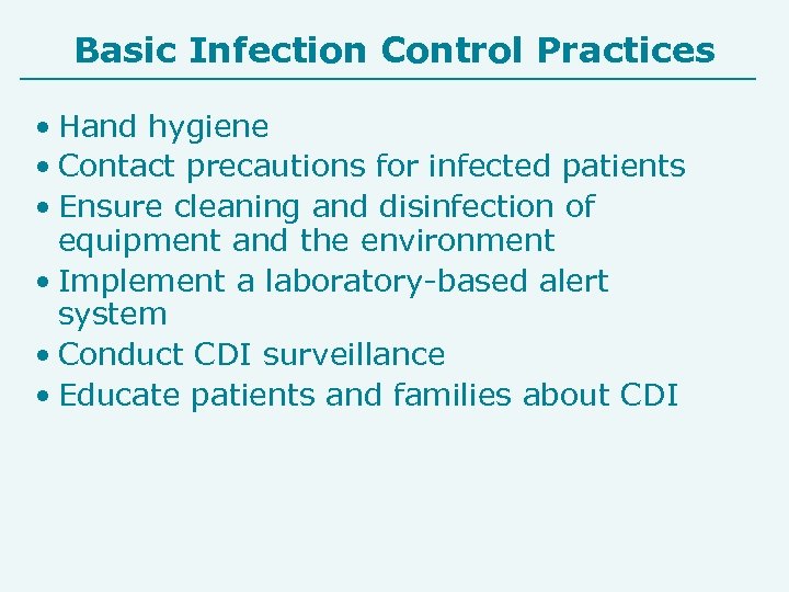 Basic Infection Control Practices • Hand hygiene • Contact precautions for infected patients • Ensure cleaning and disinfection of equipment and the environment • Implement a laboratory-based alert system • Conduct CDI surveillance • Educate patients and families about CDI