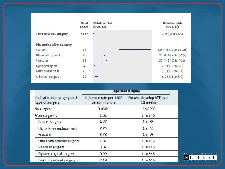 Million Women Study • Population-based, prospective cohort study • 947, 454 middle-aged women in U. K. enrolled between 1996 -2001 • Mean follow-up 6. 2 years • 239, 614 underwent surgery – 5, 419 readmitted for VTE within 12 weeks of inpatient surgery – 270 deaths from fatal PE Sweetland et al. BMJ. 2009; 339: b 4583.