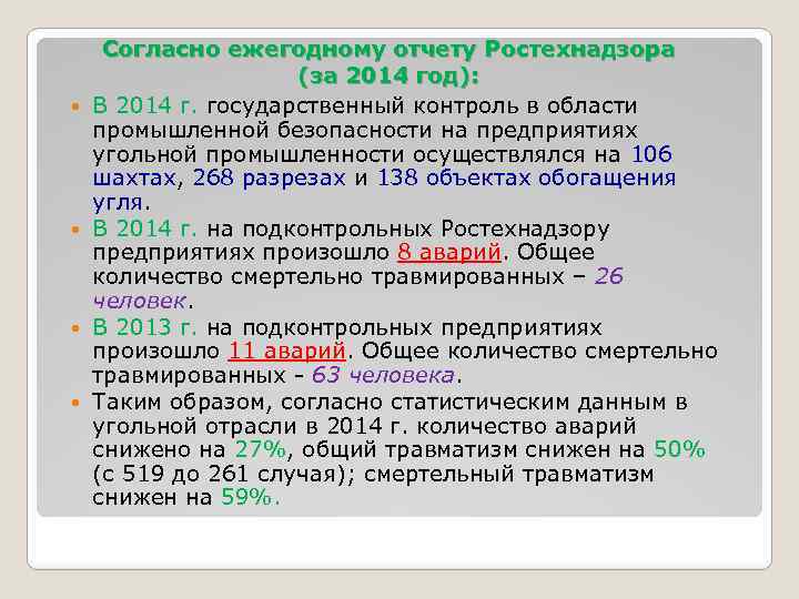 Согласно ежегодному отчету Ростехнадзора (за 2014 год): В 2014 г. государственный контроль в области промышленной безопасности на предприятиях угольной промышленности осуществлялся на 106 шахтах, 268 разрезах и 138 объектах обогащения угля. В 2014 г. на подконтрольных Ростехнадзору предприятиях произошло 8 аварий. Общее количество смертельно травмированных – 26 человек. В 2013 г. на подконтрольных предприятиях произошло 11 аварий. Общее количество смертельно травмированных - 63 человека. Таким образом, согласно статистическим данным в угольной отрасли в 2014 г. количество аварий снижено на 27%, общий травматизм снижен на 50% (с 519 до 261 случая); смертельный травматизм снижен на 59%.