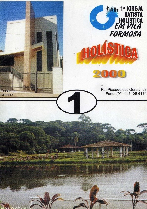 Prezados irmãos, Membros da Primeira Igreja Batista Holística em Vila Formosa Rua Piedade dos Gerais, 68 – Cidade de São Paulo – SP É com imensa alegria que passo às suas mãos o primeiro livreto de uma série sobre este assunto novo no qual temos trabalhado intensamente nos últimos meses visando estabelecer as informações básicas que servirão para nós tanto quanto para os outros fora do nosso meio. Na verdade, hoje, estamos compartilhando da mesma alegria, pois, juntos temos trabalhado por muitos anos aguardando por esta hora que chegou e nos permite iniciar a fase dois propriamente dita no aspecto eclesiástico, porque, em relação aos projetos já havíamos começado um deles, ainda que precariamente, mas, começamos no dia 6 de dezembro de 1999 e de lá para esta parte todos sabemos quanto trabalho realizamos. . . Estas informações do livreto número 1 são gerais e servem para fazermos a apresentação da PRIMEIRA IGREJA BATISTA HOLÍSTICA EM VILA FORMOSA à qual nós temos o privilégio de pertencer e a oportunidade de divulgar. O livreto número 2 que sairá em breve tratará do cerne dessa nova modalidade eclesiástica que é o COMPROMISSO entre membro e igreja, e, entre igreja e membro, por escrito e registrado permitindo a ambas as partes livre expressão de seus interesses e propósitos para honra e glória do Senhor do Céu e da Terra por quem fomos salvos e servimos com muito amor e fidelidade, Jesus Cristo, o Deus Eterno. Gostaria de mencionar nesta página os nomes de todos os membros de nossa Igreja que estão conosco neste momento tão importante, porém, não nos é possível fazê-lo, mas, sem dúvida, quando da publicação do volume 2, certamente, o faremos! O conteúdo deste pequeno volume também serve para dirimir dificuldades que já apareceram nas cabeças de alguns de fora do nosso meio não entendendo nossos motivos e objetivos com esta aquisição da Igreja Holística que nada mais é do que um conceito