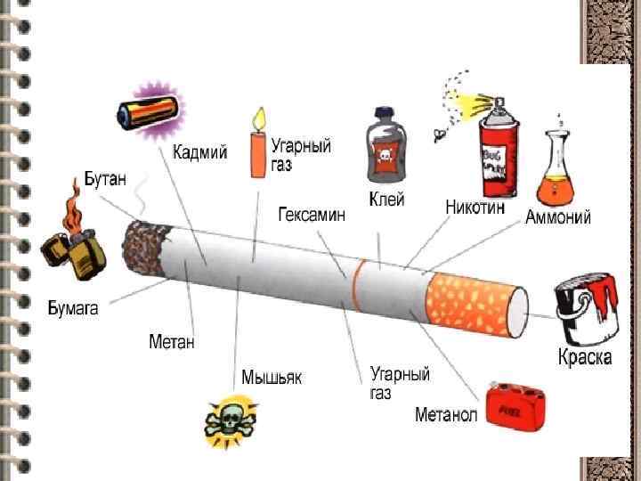 При курении происходит сухая перегонка табака, в результате образуются токсичные вещества. Свыше 200 из них опасны для организма. Вредные вещества: никотин, эфирные масла, окись углерода (угарный газ), углекислый газ, аммиак, табачный деготь, полоний-510 (он излучает гамма-лучи, в моче курящих его в 6 раз больше, чем у некурящих), свинец, висмут, мышьяк, калин, а также масляная, уксусная, муравьиная, валериановая и синильная кислоты, сероводород, формальдегид и пр.