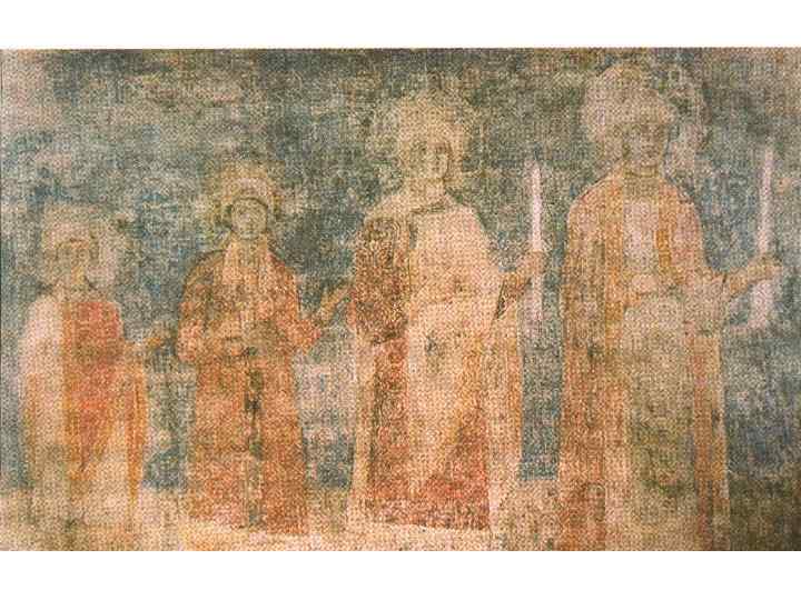 6. Изобразительное искусство Применялось при оформлении внутреннего убранства соборов, церквей. Стены покрывались фресками – картины, написанные водяными красками по сырой штукатурке. Мозаика – картины из вдавленных в сырую штукатурку стекловидных камешков. Иконы