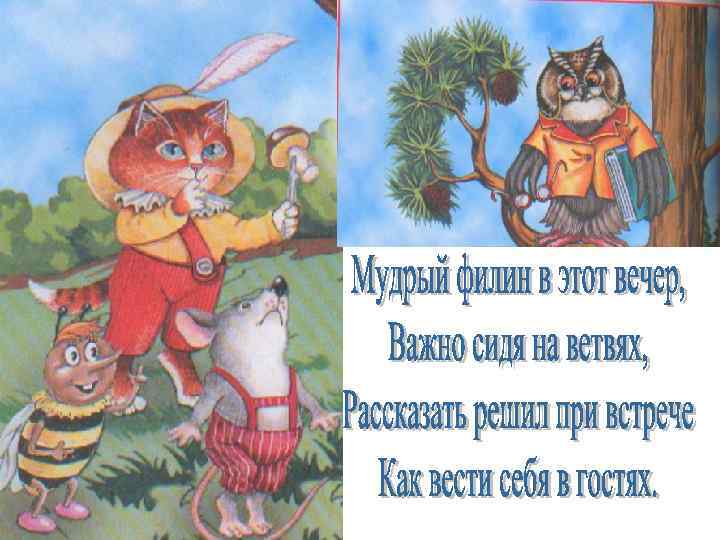 • Растерялась, загрустила И Енота не пустила, Только вымолвить смогла: -Я попозже вас ждала… Неприятно и Еноту, И Лисице грустно что-то. Умный гость, хотя и званый, Не приходит слишком рано.