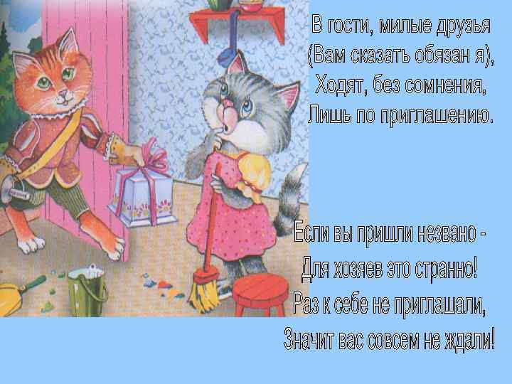 Наконец он появился, Сел за стол, не извинился. Ну и поведенье! Стыдно, без сомненья. Если в гости звали вас, Нужно не копаться И в определённый час Дружно всем собраться. Вы, чтоб друзей не обижать, Себя не заставляйте ждать.