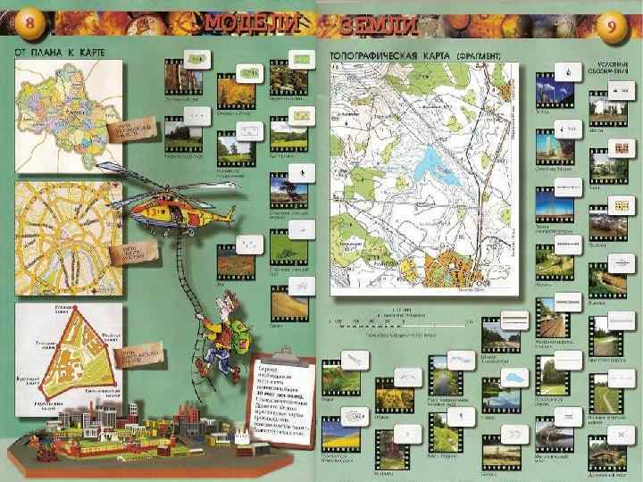 Глобус это объёмная модель планеты, уменьшенная во много раз. Картаобобщенное уменьшенное изображение земной поверхности на плоскости с помощью условных знаков. План – это чертёж, на котором условными знаками изображён в уменьшенном виде небольшой участок земной поверхности. Условные знаки плана отличаются от условных знаков карты.