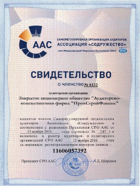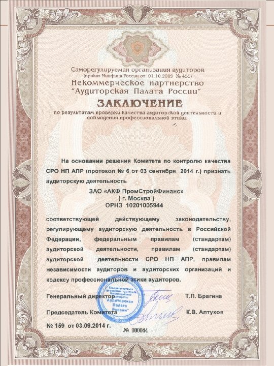 СВЕДЕНИЯ О КОМПАНИИ ЗАО «АКФ Пром. Строй. Финанс» осуществляет свою деятельность на рынке аудиторских и консультационных услуг с 1994 г. и входит в число авторитетных фирм на Российском рынке. ЗАО «АКФ Пром. Строй. Финанс» является членом саморегулируемой организации аудиторов Некоммерческого партнерства «Аудиторская Палата России» и включена в реестр данной организации 28. 12. 2009 г. за основным регистрационным номером: 10201005944. По итогам рейтингов агентства «Эксперт РА» ЗАО «АКФ Пром. Строй. Финанс» входит в список 100 крупнейших аудиторско - консалтинговых групп России. Укрепление позиций Компании на рынке аудиторских и консалтиговых услуг вызвано прогрессивной политикой, направленной на предоставление нашим Клиентам продукта высокого качества, работой в Компании высокопрофессиональных специалистов с богатым опытом, хорошими отзывами Клиентов о нашей работе. В июне 2014 года НП «Аудиторская Палата России» была проведена проверка качества аудиторской деятельности и соблюдения профессиональной этики ЗАО «АКФ Пром. Строй. Финанс» за 2011 – 2013 годы. Наша Компания успешно и с высокой оценкой прошла проверку. ЗАО «АКФ Пром. Строй. Финанс» ежегодно страхует риск ответственности за нарушение условий договоров об оказании аудиторских услуг. Профессиональная ответственность Компании на 2016 год застрахована ЗАО «Страховая группа «Урал. Сиб» на сумму 30 млн. руб. Обращаем Ваше внимание, что за весь период профессиональной деятельности ЗАО «АКФ Пром. Строй. Финанс» страховые случаи не наступали ни разу, что объясняется высоким качеством оказываемых нами услуг. В своей работе мы гарантируем полную независимость и объективность, а также безусловную конфиденциальность полученных сведений и сделанных выводов.