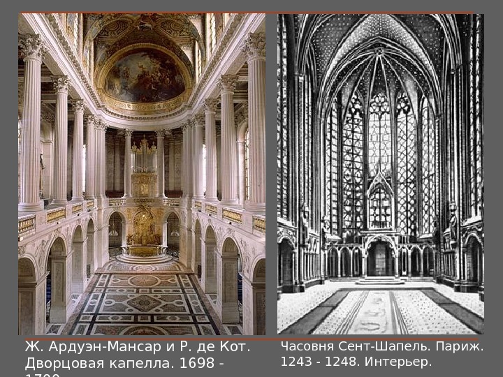 Часовня Сент-Шапель. Париж. 1243 — 1248. Интерьер. Ж. Ардуэн-Мансар и Р. де Кот. Дворцовая капелла. 1698 — 1700.