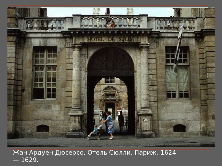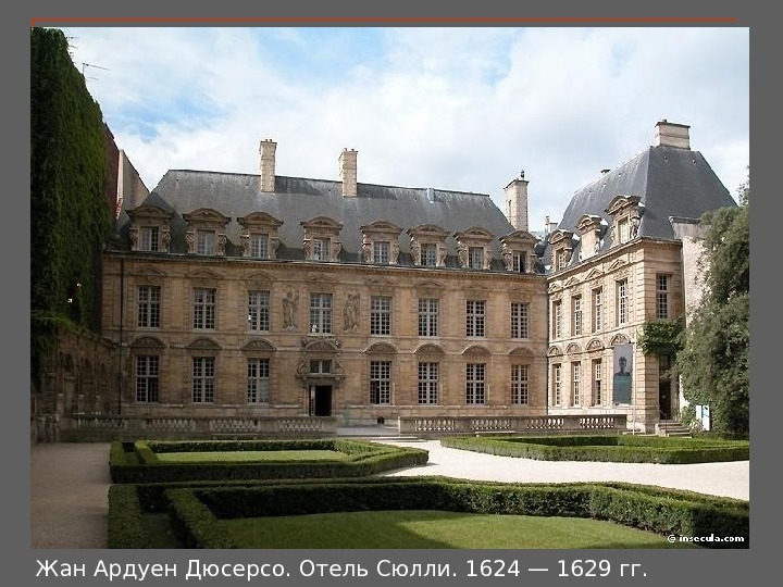 Отель Сюлли, 1625 г. , образец стиля Людовика XIII, назван по имени его владельца, бывшего министра Генриха IV. Дворовый фасад имеет богатый скульптурный декор люкарн, украшен аллегорическими фигурами четырех времен года и четырех основных стихий. Жан Ардуен Дюсерсо. Отель Сюлли. Париж. 1624 — 1629.