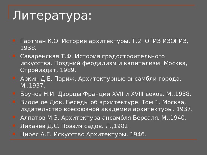 Литература: Гартман К. О. История архитектуры. Т. 2. ОГИЗ ИЗОГИЗ, 1938. Саваренская Т. Ф. История градостроительного искусства. Поздний феодализм и капитализм. Москва, Стройиздат, 1989. Аркин Д. Е. Париж. Архитектурные ансамбли города. М. , 1937. Брунов Н. И. Дворцы Франции Х VII и XVIII веков. М. , 1938. Виоле ле Дюк. Беседы об архитектуре. Том 1. Москва, издательство всесоюзной академии архитектуры. 1937. Алпатов М. З. Архитектура ансамбля Версаля. М. , 1940. Лихачев Д. С. Поэзия садов. Л. , 1982. Цирес А. Г. Искусство Архитектуры. 1946.