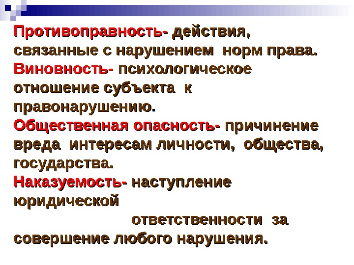 Противоправность- действия, связанные с нарушением норм права. Виновность- психологическое отношение субъекта к правонарушению. . Общественная опасность- причинение вреда интересам личности, общества, государства. Наказуемость- наступление юридической ответственности за совершение любого нарушения.
