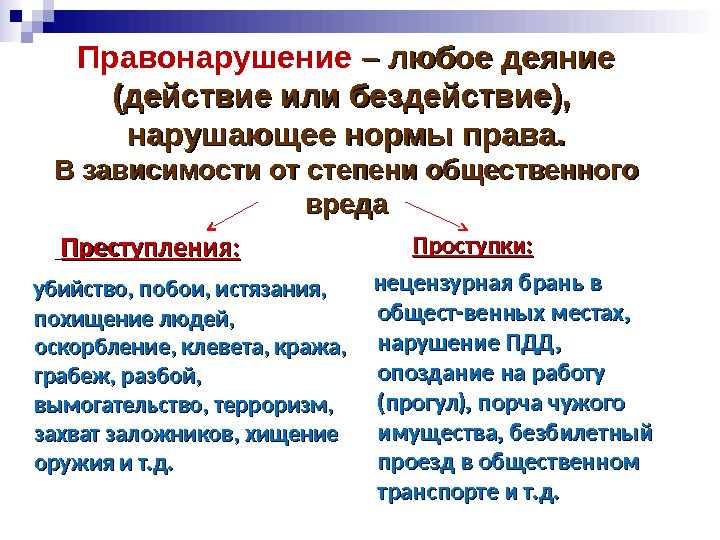 Правонарушение – любое деяние (действие или бездействие), нарушающее нормы права. В зависимости от степени общественного вреда Преступления: убийство, побои, истязания, похищение людей, оскорбление, клевета, кража, грабеж, разбой, вымогательство, терроризм, захват заложников, хищение оружия и т. д. Проступки: нецензурная брань в общест-венных местах, нарушение ПДД, опоздание на работу (прогул), порча чужого имущества, безбилетный проезд в общественном транспорте и т. д.