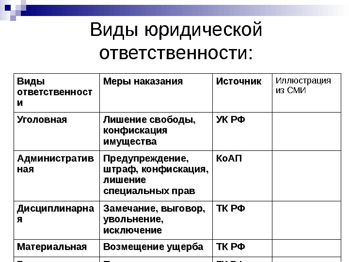 Виды юридической ответственности: Виды ответственност ии Меры наказания Источник Иллюстрация из СМИ Уголовная Лишение свободы, конфискация имущества УК РФ Административ наяная Предупреждение, штраф, конфискация, лишение специальных прав Ко. АП Дисциплинарна яя Замечание, выговор, увольнение, исключение ТК РФ Материальная Возмещение ущерба ТК РФ Гражданская Полное возмещение вреда и восстановление прав ГК РФ