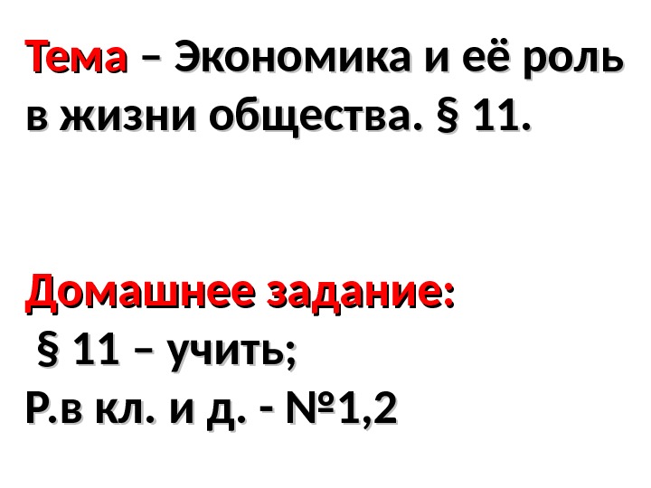 Тема – Экономика и её роль в жизни общества. § 11. Домашнее задание: § 11 – учить; Р. в кл. и д. — № 1,