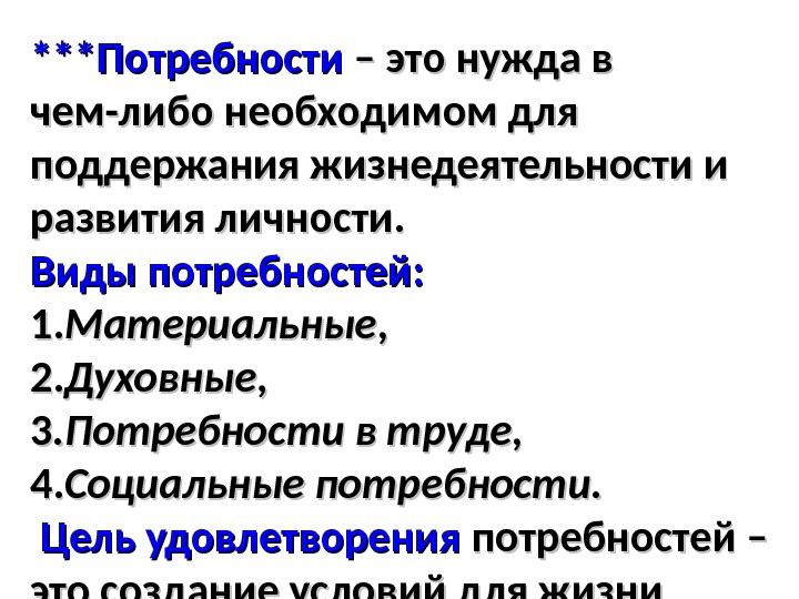 ***Потребности – это нужда в чем-либо необходимом для поддержания жизнедеятельности и развития личности. Виды потребностей: 1. 1. Материальные , , 2. 2. Духовные , , 3. 3. Потребности в труде, 4. 4. Социальные потребности. Цель удовлетворения потребностей – это создание условий для жизни людей