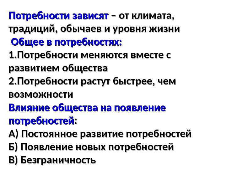 Потребности зависят – от климата, традиций, обычаев и уровня жизни Общее в потребностях: 1. Потребности меняются вместе с развитием общества 2. Потребности растут быстрее, чем возможности Влияние общества на появление потребностей : : А) Постоянное развитие потребностей Б) Появление новых потребностей В) Безграничность