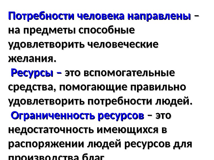 Потребности человека направлены – – на предметы способные удовлетворить человеческие желания. Ресурсы – это вспомогательные средства, помогающие правильно удовлетворить потребности людей. Ограниченность ресурсов – это недостаточность имеющихся в распоряжении людей ресурсов для производства благ
