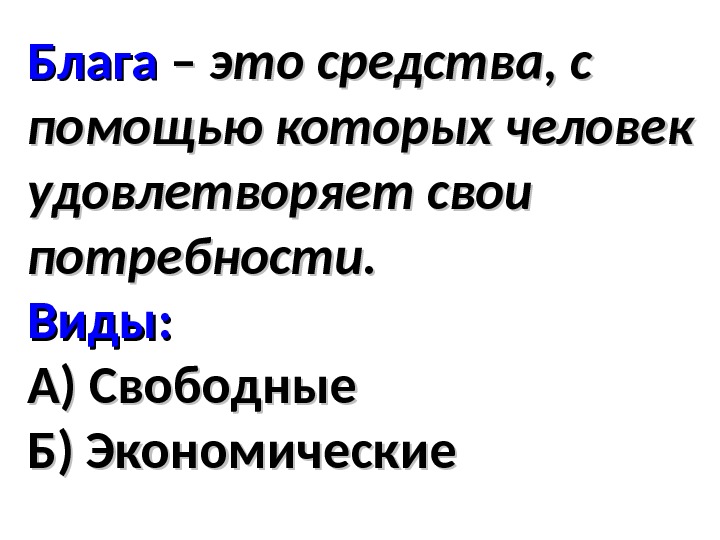 Блага – – это средства, с помощью которых человек удовлетворяет свои потребности. Виды: А) Свободные Б) Экономические