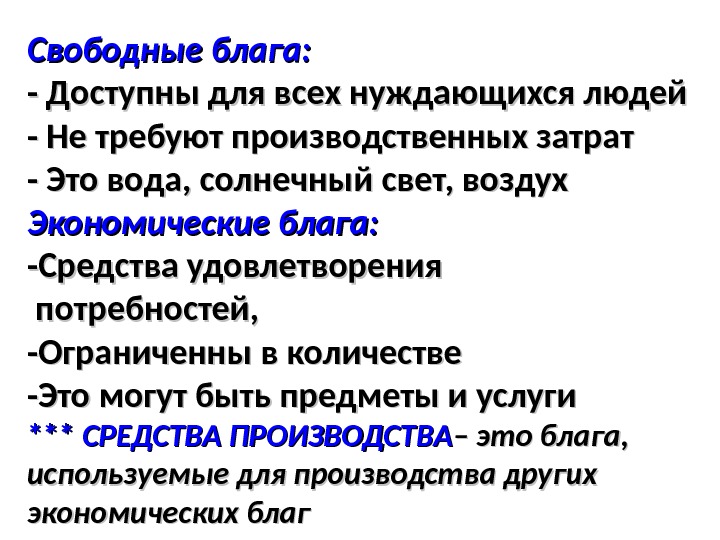 Свободные блага: — Доступны для всех нуждающихся людей — Не требуют производственных затрат — Это вода, солнечный свет, воздух Экономические блага: -Средства удовлетворения потребностей, -Ограниченны в количестве -Это могут быть предметы и услуги ****** СРЕДСТВА ПРОИЗВОДСТВА – это блага, используемые для производства других экономических благ