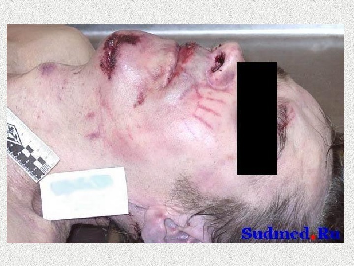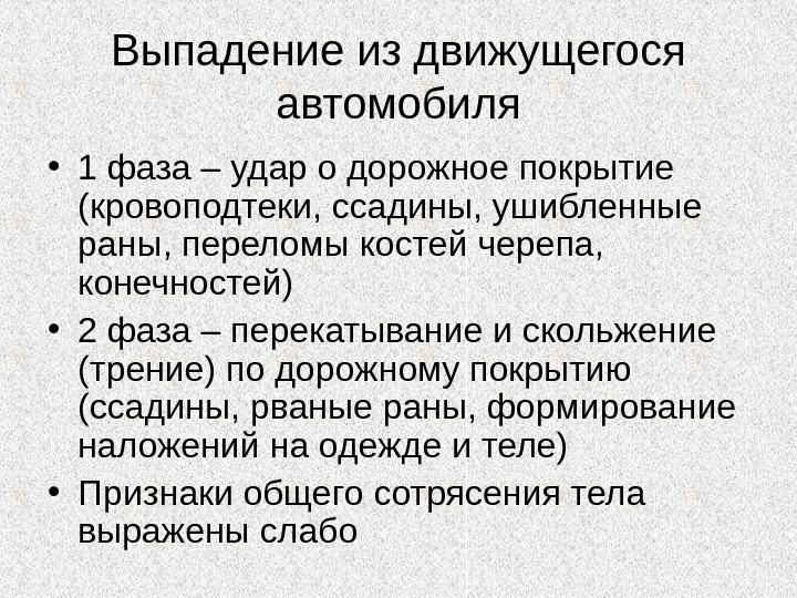 Выпадение из движущегося автомобиля • 1 фаза – удар о дорожное покрытие (кровоподтеки, ссадины, ушибленные раны, переломы костей черепа, конечностей) • 2 фаза – перекатывание и скольжение (трение) по дорожному покрытию (ссадины, рваные раны, формирование наложений на одежде и теле) • Признаки общего сотрясения тела выражены слабо