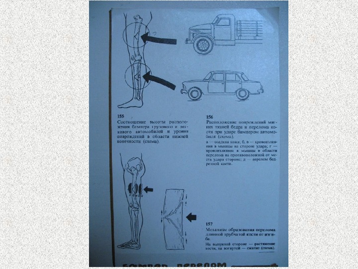 Сдавление между двумя автомобилями Сдавление между а/м и тупым предметом • Одна фаза • Повреждения – размятие мягких тканей, переломы костей черепа, ребер, конечностей. Разрывы внутренних органов. • Разрывы одежды, наложения на одежде