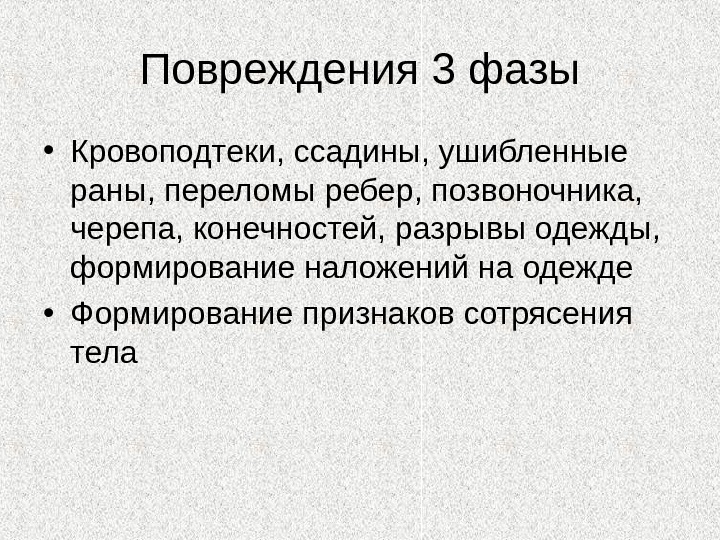 Повреждения 2 фазы • Кровоподтеки, ссадины, ушибленные раны, переломы ребер, позвоночника, разрывы одежды • Формирование признаков сотрясения тела