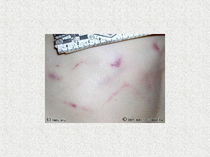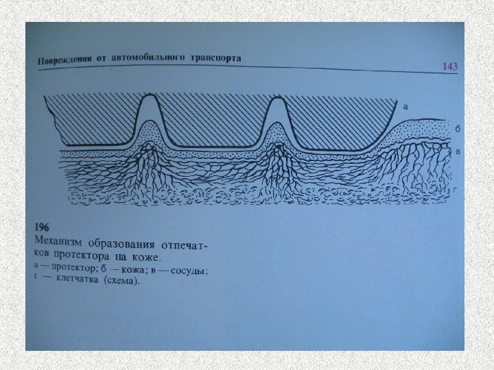Повреждения бывают • Специфичные – отображают свойства контактирующей поверхности (штампованные ссадины, раны, кровоподтеки) • Характерные – свидетельствуют об автотравме вообще • Неспецифичные – бывают при любом другом травматизме • Симулирующие – никогда не бывают при автотравме