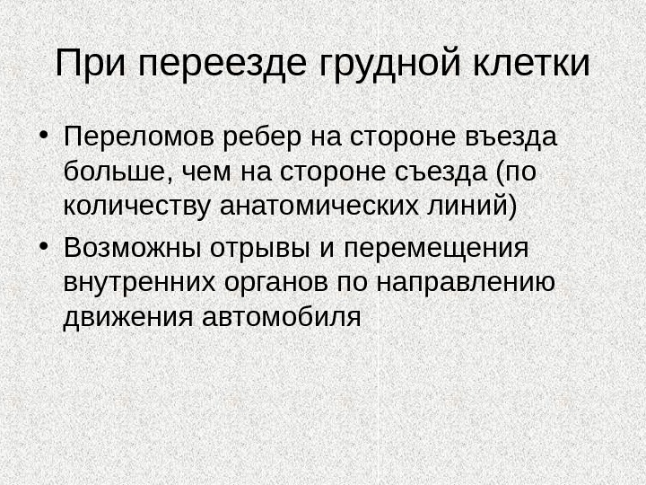 При переезде грудной клетки • Переломов ребер на стороне въезда больше, чем на стороне съезда (по количеству анатомических линий) • Возможны отрывы и перемещения внутренних органов по направлению движения автомобиля