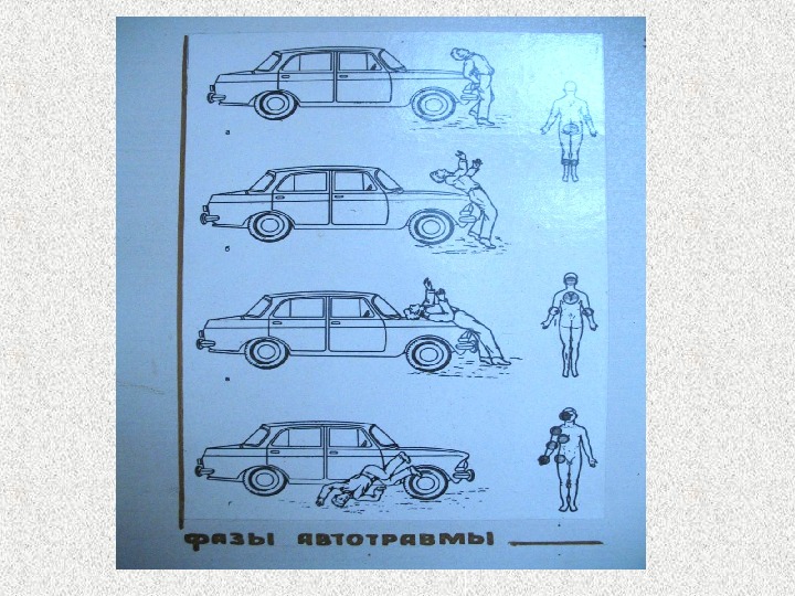 Травма в салоне • 1 фаза – движение тела вперед (удар грудной клетки о руль, коленей в панель приборов, головой в панель приборов, грудной клеткой о ремень безопасности, стопами в пол, руками о панель приборов и выступающие части двери) • 2 фаза – движение тела назад (удар о сиденье, запрокидывание головы)