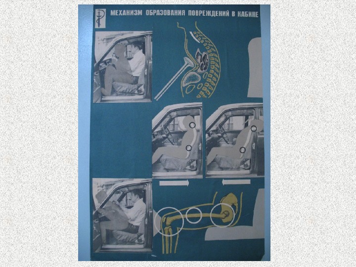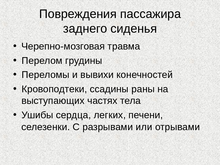 Повреждения пассажира заднего сиденья • Черепно-мозговая травма • Перелом грудины • Переломы и вывихи конечностей • Кровоподтеки, ссадины раны на выступающих частях тела • Ушибы сердца, легких, печени, селезенки. С разрывами или отрывами