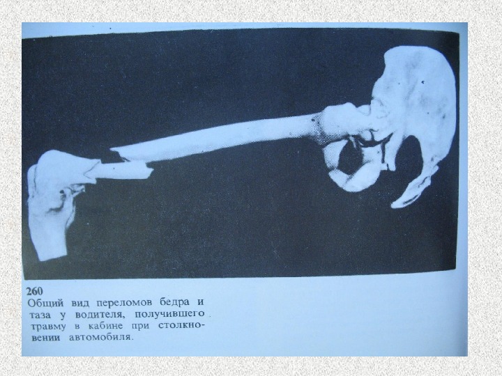 Повреждения пассажира переднего сиденья • Хлыстообразный перелом позвоночника в шейном отделе • Черепно-мозговая травма • Перелом бедра (диафиза, шейки) • Вывих тазобедренного сустава (Переломовывих) • Кровоподтеки, ссадины раны на выступающих частях тела • Ушибы сердца, легких, печени, селезенки. С разрывами или отрывами