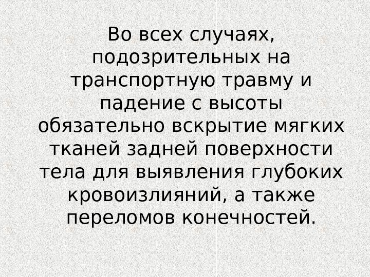 Во всех случаях, подозрительных на транспортную травму и падение с высоты обязательно вскрытие мягких тканей задней поверхности тела для выявления глубоких кровоизлияний, а также переломов конечностей.