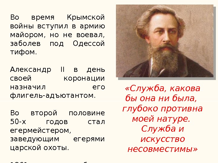 Во время Крымской войны вступил в армию майором, но не воевал, заболев под Одессой тифом. Александр II в день своей коронации назначил его флигель-адъютантом. Во второй половине 50-х годов стал егермейстером, заведующим егерями царской охоты. 1861 – добился отставки «Служба, какова бы она ни была, глубоко противна моей натуре. Служба и искусство несовместимы»