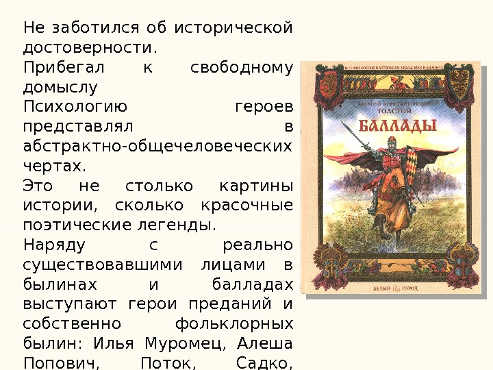Не заботился об исторической достоверности. Прибегал к свободному домыслу Психологию героев представлял в абстрактно-общечеловеческих чертах. Это не столько картины истории, сколько красочные поэтические легенды. Наряду с реально существовавшими лицами в былинах и балладах выступают герои преданий и собственно фольклорных былин: Илья Муромец, Алеша Попович, Поток, Садко, Чурила и др.