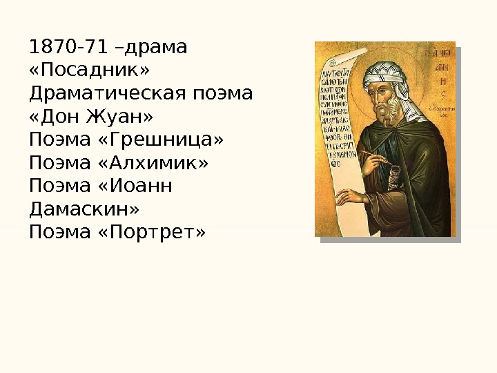 1870-71 –драма «Посадник» Драматическая поэма «Дон Жуан» Поэма «Грешница» Поэма «Алхимик» Поэма «Иоанн Дамаскин» Поэма «Портрет»