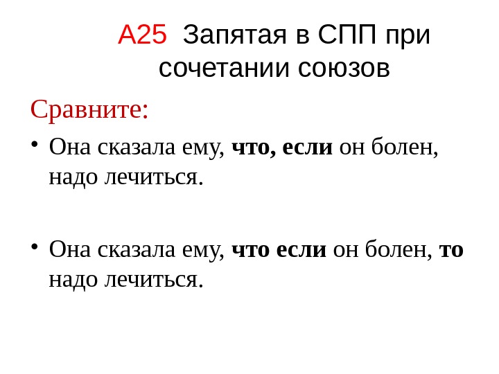 А 25 Запятая в СПП при сочетании союзов Сравните: • Она сказала ему, что, если он болен, надо лечиться. • Она сказала ему, что если он болен, то надо лечиться.