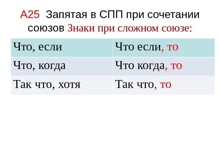 А 25 Запятая в СПП при сочетании союзов Знаки при сложном союзе: Что, если Что если , то Что, когда Что когда , то Так что, хотя Так что , то