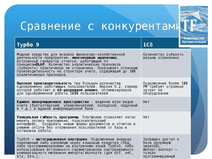 Сравнение с конкурентами Турбо 9 1С 8 Мощные средства для анализа финансово-хозяйственной деятельности предприятия: многомерная аналитика , встроенный генератор отчетов, работающий по принципам OLAP. Количество аналитических признаков (субконто) практически не ограничено. Показывает отличную производительность на структуре учета, содержащей до 100 аналитических признаков. Количество субконто весьма ограничено Высокая производительность при большом количестве одновременно работающих пользователей. Версия 9. 2, сервер которой работает в 64-разрядном режиме , оптимизирована для одновременной работы 1000 пользователей Подключение более 100 РМ требует огромных затрат на оборудование Единое информационное пространство — ведение всех видов учета (бухгалтерский, управленческий, складской, кадровый и т. д. ) в единой информационной базе Нет Уникальная гибкость программы. Платформа позволяет легко менять логику приложения, пользовательский интерфейс, создавать новые формы документов и отчетов в режиме online без отключения пользователей от базы и остановки работы. Нет Турбо 9 – интеграционная платформа. Подключение внешних приложений либо напрямую через языковые средства СУБД, либо программированием на внутреннем языке Турбо 9, либо использование встроенного параметрически настраиваемого универсального механизм импорта/экспорта (для dbf, xml, xls, csv…). Запрещен доступ к базе напрямую через SQL. Импорт-экспорт – только программируемый.