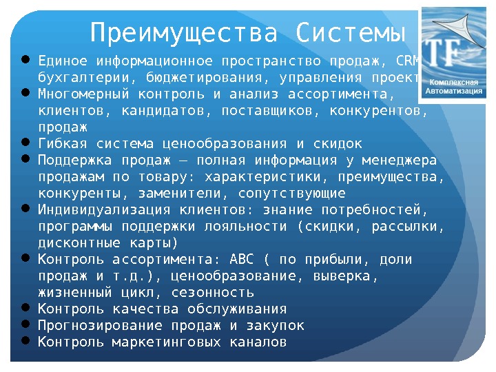 Преимущества Системы Единое информационное пространство продаж, CRM, бухгалтерии, бюджетирования, управления проектами Многомерный контроль и анализ ассортимента, клиентов, кандидатов, поставщиков, конкурентов, продаж Гибкая система ценообразования и скидок Поддержка продаж — полная информация у менеджера продажам по товару: характеристики, преимущества, конкуренты, заменители, сопутствующие Индивидуализация клиентов: знание потребностей, программы поддержки лояльности (скидки, рассылки, дисконтные карты) Контроль ассортимента: ABC ( по прибыли, доли продаж и т. д. ), ценообразование, выверка, жизненный цикл, сезонность Контроль качества обслуживания Прогнозирование продаж и закупок Контроль маркетинговых каналов