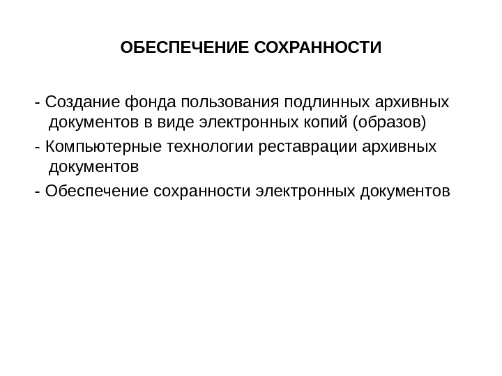 ОБЕСПЕЧЕНИЕ СОХРАННОСТИ ЭЛЕКТРОННЫХ ДОКУМЕНТОВ Обеспечение оптимального режима хранения физических носителей электронных документов: — поддержание оптимальных температурно-влажностных параметров, — защита от электромагнитных воздействий Перевод электронных документов на современные носители Сохранение (конвертация) ранее исчезающих из использования форматов