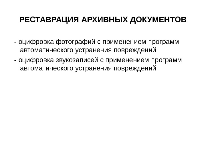РЕСТАВРАЦИЯ АРХИВНЫХ ДОКУМЕНТОВ — оцифровка фотографий с применением программ автоматического устранения повреждений — оцифровка звукозаписей с применением программ автоматического устранения повреждений