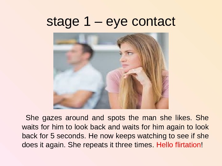 stage 1 – eye contact She gazes around and spots the man she likes. She waits for him to look back and waits for him again to look back for 5 seconds. He now keeps watching to see if she does it again. She repeats it three times. Hello flirtation !