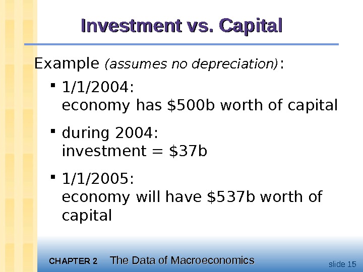 CHAPTER 2 The Data of Macroeconomics slide 15 Investment vs. Capital Example (assumes no depreciation) : 1/1/2004: economy has $500 b worth of capital during 2004: investment = $37 b 1/1/2005: economy will have $537 b worth of capital