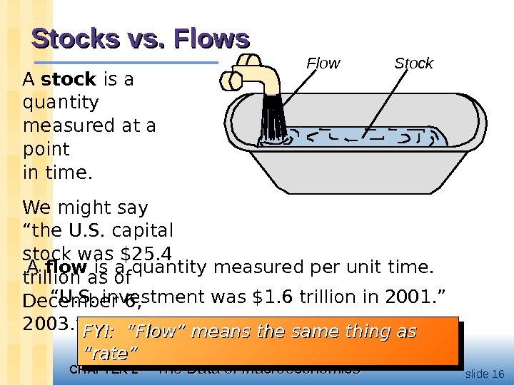 CHAPTER 2 The Data of Macroeconomics slide 16 Stocks vs. Flows A flow is a quantity measured per unit time. “ U. S. investment was $1. 6 trillion in 2001. ” Flow Stock A stock is a quantity measured at a point in time. We might say “the U. S. capital stock was $25. 4 trillion as of December 6, 2003. ” FYI: “Flow” means the same thing as “rate”FYI: “Flow” means the same thing as “rate”