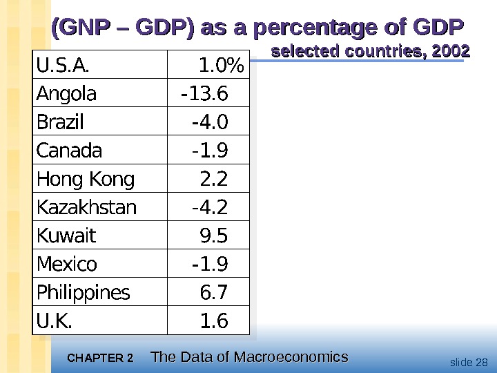 CHAPTER 2 The Data of Macroeconomics slide 28(GNP – GDP) as a percentage of GDP selected countries,