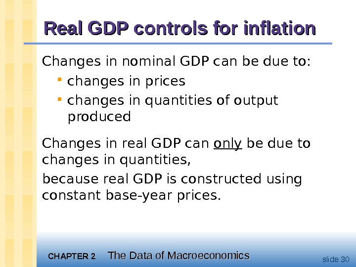 CHAPTER 2 The Data of Macroeconomics slide 30 Real GDP controls for inflation Changes in nominal GDP can be due to: changes in prices changes in quantities of output produced Changes in real GDP can only be due to changes in quantities, because real GDP is constructed using constant base-year prices.