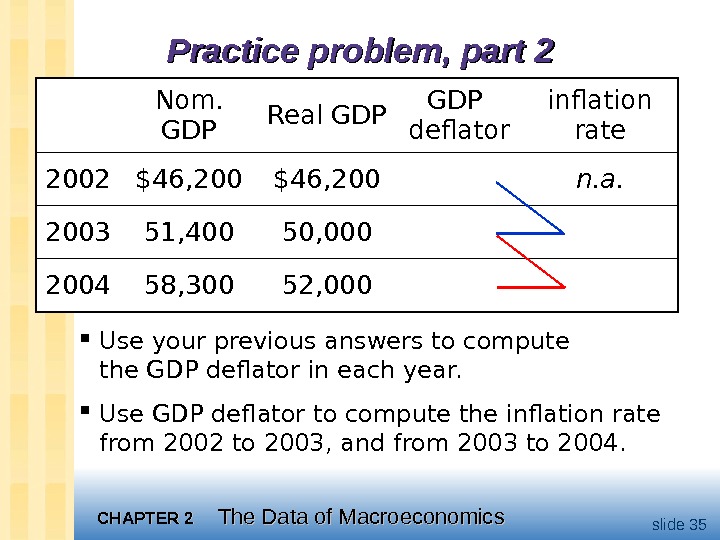 CHAPTER 2 The Data of Macroeconomics slide 36 Answers to practice problem, part 2 Nom. GDP Real GDP deflator inflation rate 2002 $46, 200 100. 0 n. a. 2003 51, 400 50, 000 102. 8% 2004 58, 300 52, 000 112. 1 9. 1%
